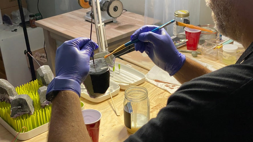 Sanding each Amethyst creates a smooth exterior surface so the plating process can produce an exterior gold finish.